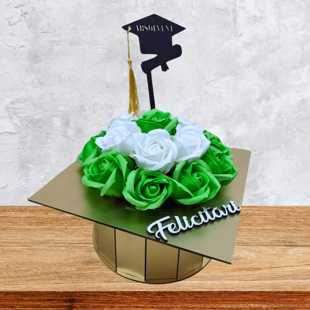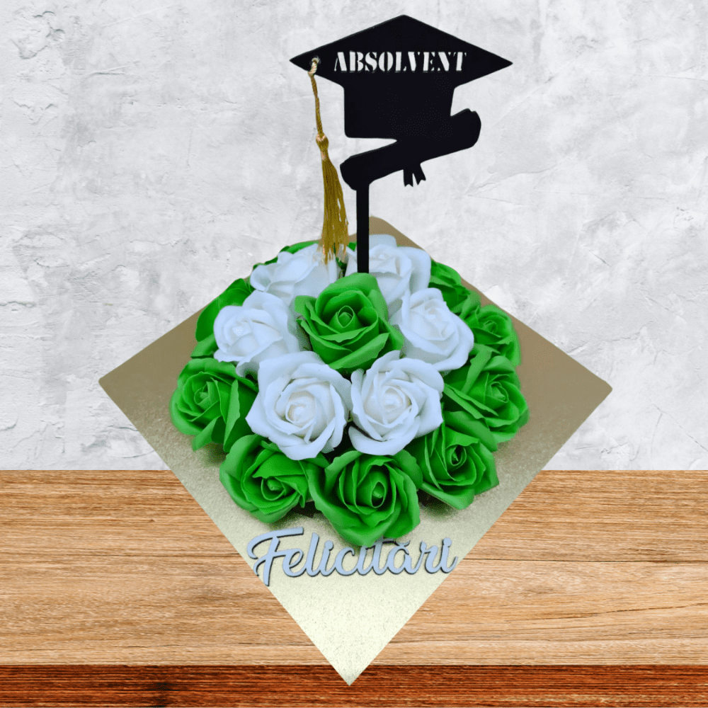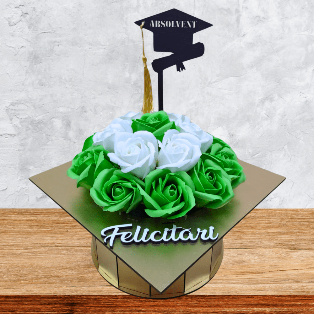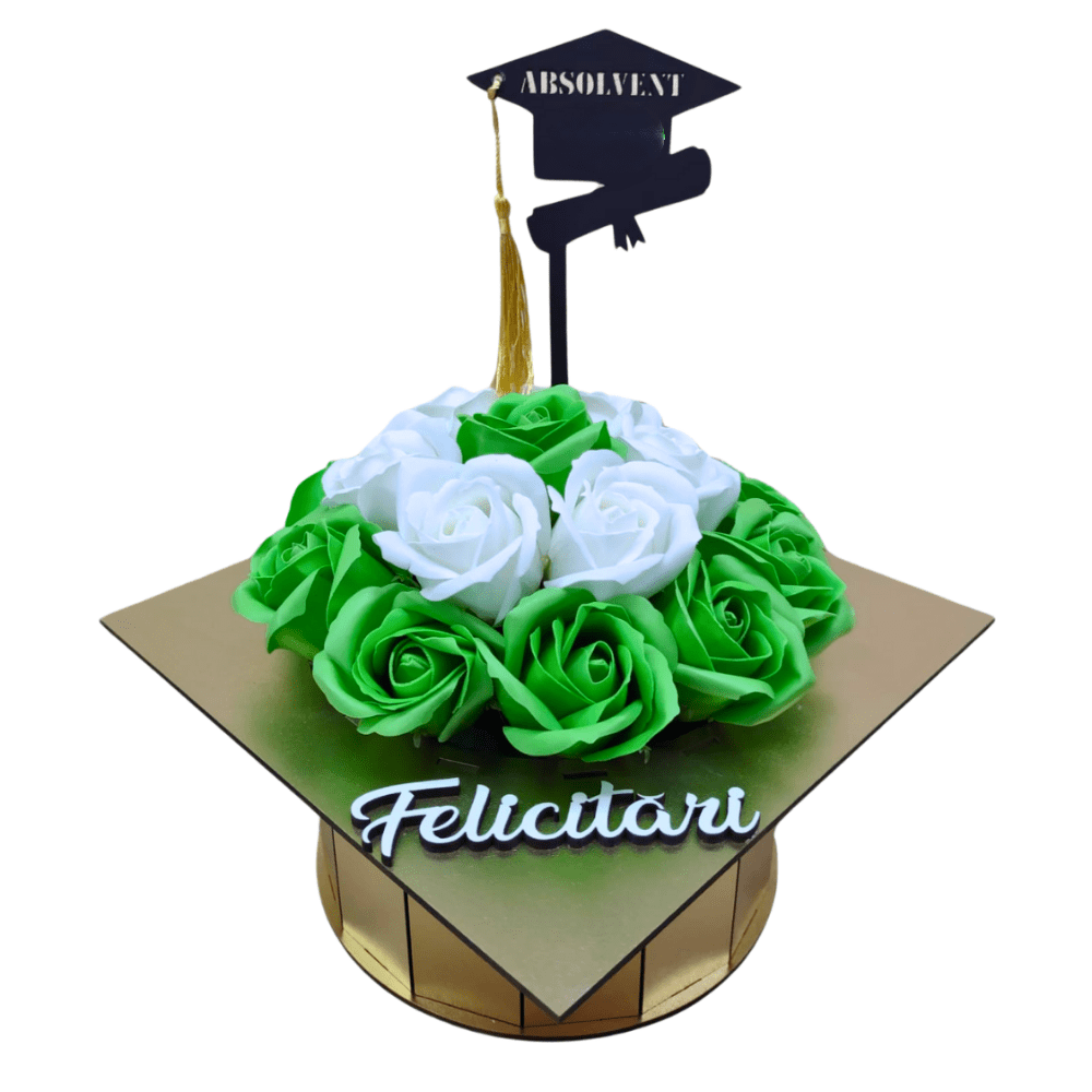 Aranjament floral in cutie tip toca din lemn, un cadou unic si memorabil care marcheaza un moment important din viata, memorabilul eveniment al absolvirii. Ofera un cadou inedit, realizat 100% manual, cu flori de sapun parfumate si un topper care marcheaza anul absolvirii.
