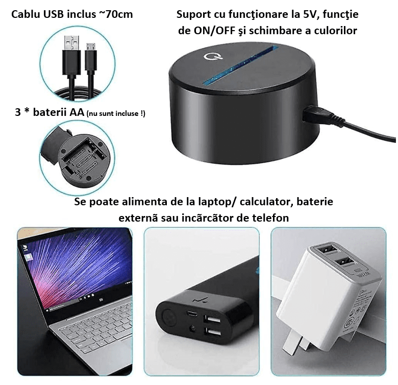 • Alimentare cu cablu USB (inclus) sau baterii 3 x AA (neincluse).
